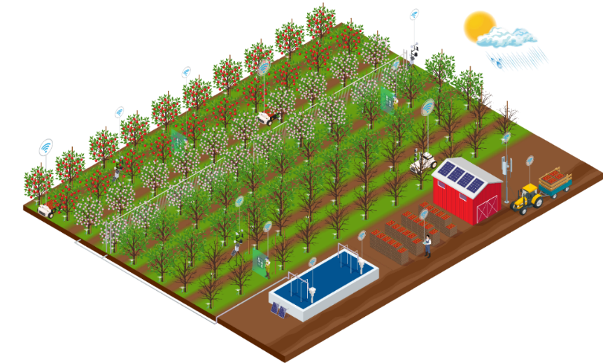 Abb. 2: Konzeptdarstellung des Obstbau-Zukunftsbetriebs im Alten Land – Digitale Vernetzung, autonome Maschinen und KI-basierte Auswertealgorithmen werden auf dem Experimentierfeld im Projekt SAMSON erforscht (© Fraunhofer IFAM).