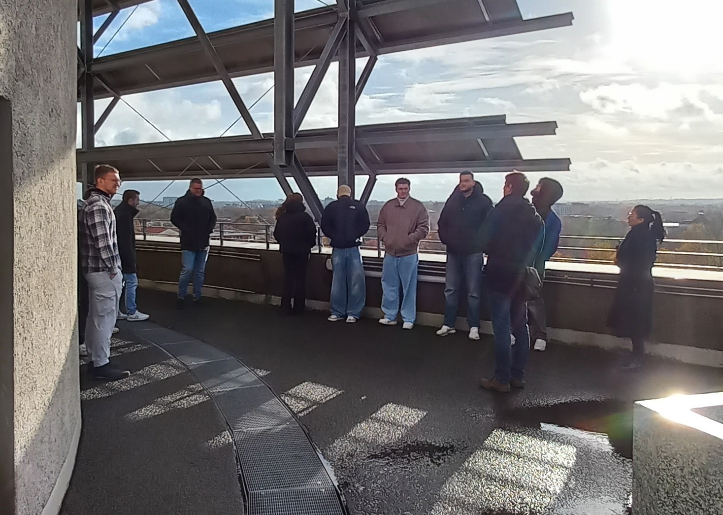 Zu Beginn erhielten die Studierenden einen Überblick über die Geschichte und das energetische Gesamtkonzept. Anschließend wurden die technischen Anlagen vor Ort besichtigt. Dazu gehören ein Warmwasserspeicher mit einem Volumen von rund zwei Millionen Litern, zwei Blockheizkraftwerke sowie moderne Gas Brennwertkessel zur Deckung der Spitzenlast. Auf dem Dach befindet sich zusätzlich eine ausgedehnte Solarthermieanlage, und an der Südfassade können großflächige Photovoltaikmodule betrachtet werden.